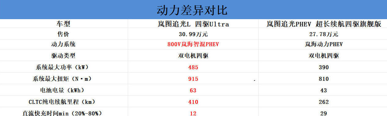 动力总成升级是核心差异,追光L搭载全域800V岚海智能超混技术,配备岚海动力1.5T全新混动发动机与双电机,发动机热效率为45.18%,系统综合功率485kW,系统总扭矩高达915N·m。