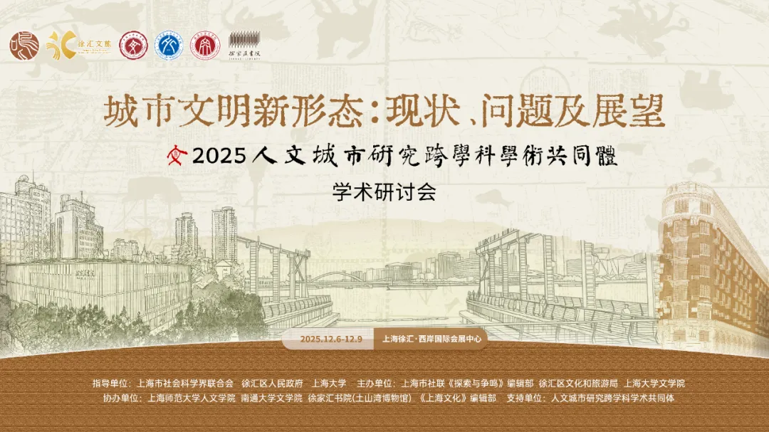 从乡土中国、城乡中国到城市中国,不仅是正在发生着的经济社会转型现实,更是人文城市的新生与城市文明的新变。为深入探讨城市文明发展现状、问题与未来,推动人文关怀深度融入城市治理,促进人民城市建设,共塑城市文明新形态。2025年12月7日至8日,由《探索与争鸣》编辑部、徐汇区文化和旅游局、上海大学文学院联合主办,上海师范大学人文学院、南通大学文学院、徐家汇书院(土山湾博物馆)、《上海文化》编辑部协办,人文城市研究跨学科学术共同体支持的“第二届(2025)人文城市研究跨学科学术共同体学术研讨会”在上海西岸国际会展中心召开。本次会议以“城市文明新形态:现状、问题及展望”为主题,旨在汇聚跨学科学术智慧,回应中国式现代化征程中的人文城市命题,共同探索具有中国特色、体现时代精神的城市文明发展新路径。