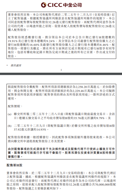 消息面上,公司于12月11日发布公告称,拟向不少于六名独立第三方投资者配售合共7000万股新股,每股配售价为32.26港元,较12月9日收盘价折让约14.93%。本次配售预计所得款项净额约为22.3亿港元。