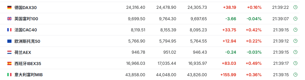 正在交易的欧洲股市涨跌不一,德国DAX指数现涨0.16%,英国富时100指数跌0.04%,法国CAC40指数涨0.42%。现货白银一度攀升至每盎司64.58美元,创历史新高。