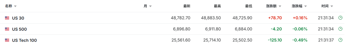截至发稿,道琼斯指数期货涨0.16%,一度创下新高;标普500指数期货跌0.06%,纳斯达克100指数期货跌0.49%。