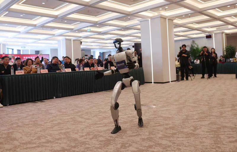 本次活动旨在探索人工智能与语言文字事业双向赋能的新路径,为学生科学素养与思辨能力的协同提升搭建成长平台。图为机器人表演开场舞蹈。