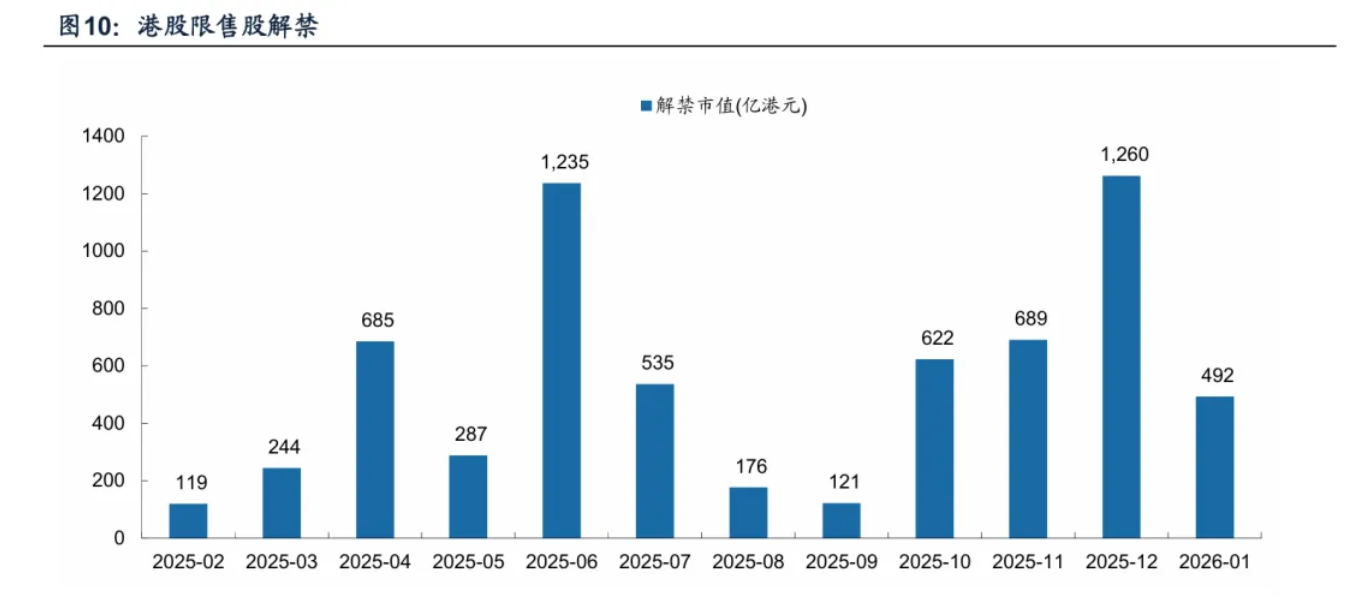 解禁高峰已过。12月限售股解禁规模约1260亿港元,1月将回落至500亿港元以下,对市场情绪扰动有限。