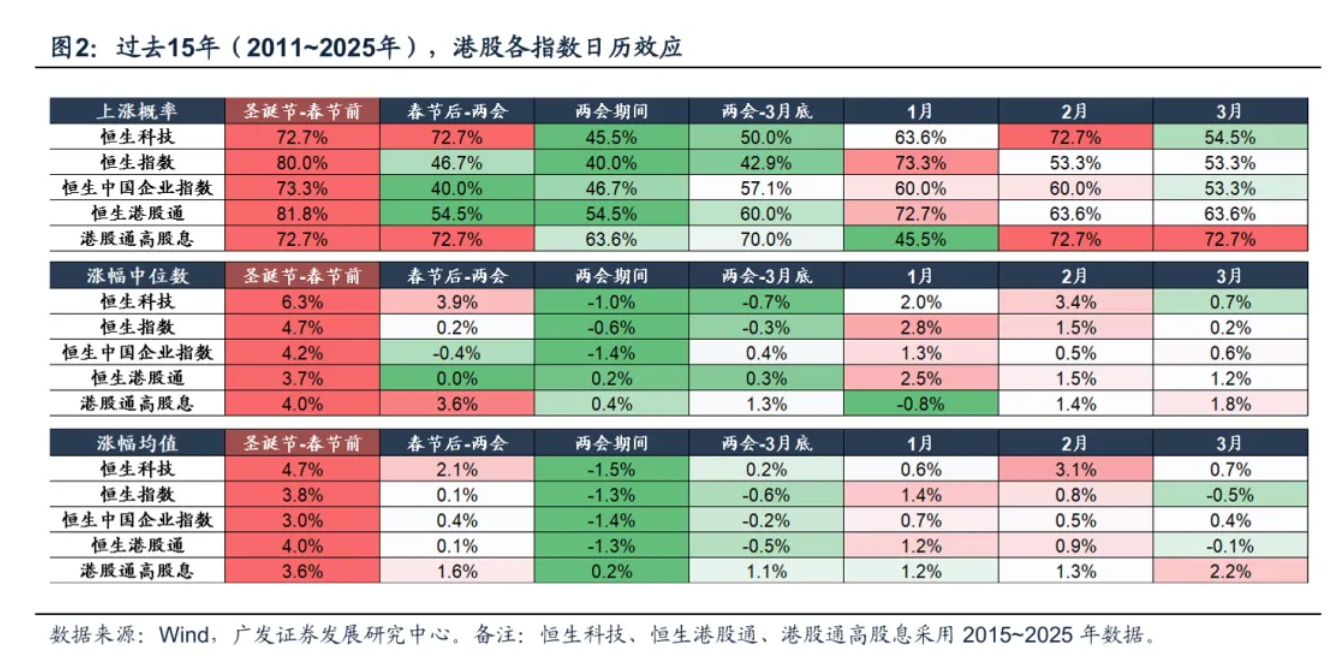 恒生科技指数同期上涨概率为72.7%,涨幅中位数达6.3%,显著优于其他时段。