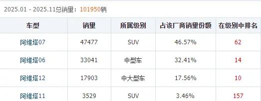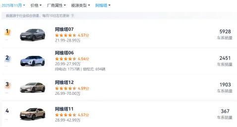 阿维塔2025年11月各车型销量情况