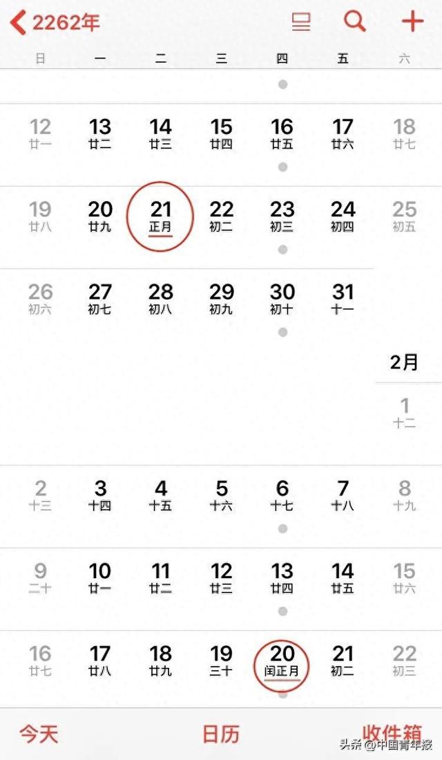 根据万年历查询,2262年1月21日是农历正月初一(第一个春节),2月20日是闰正月初一(第二个春节),这种闰正月现象十分罕见。