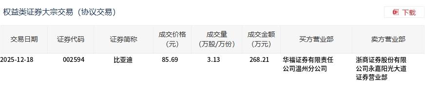 12月18日,比亚迪大宗交易成交3.13万股,成交额268.21万元,占当日总成交额的0.11%,成交价85.69元,较市场收盘价93.53元折价8.38%。