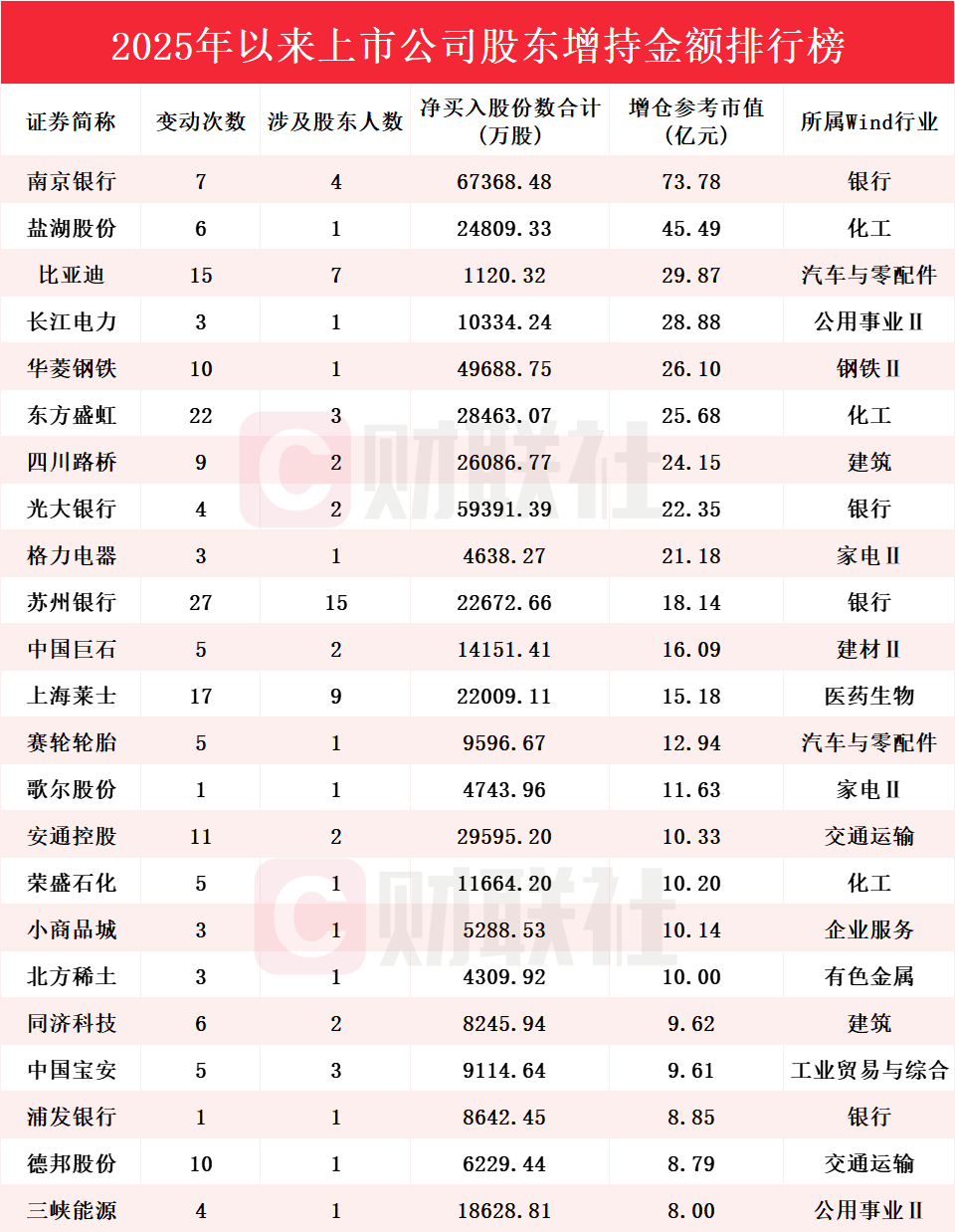 Wind数据显示,总市值1411亿、主要产品是商业银行业务的南京银行年初迄今获股东增持金额总计73.78亿元。南京银行11月21日发布公告称,法国巴黎银行(QFII)在9月29日至11月20日期间,以自有资金增持南京银行股份约1.28亿股。此次增持后,法国巴黎银行及法国巴黎银行(QFII)合计持股比例由17.02%跃升至18.06%。南京银行12月17日公告称,公司拟于2025年12月23日全额赎回0.49亿股优先股“南银优1”。为保证公平信息披露,维护投资者利益,公司拟申请于2025年12月22日对本次优先股停牌,并于2025年12月23日对本次优先股赎回注销。