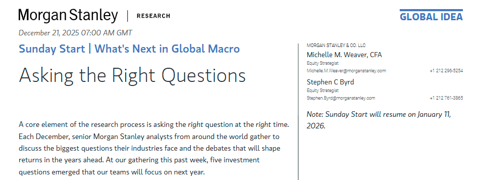 财联社12月22日讯(编辑 潇湘)每年12月,摩根士丹利全球各地的高级分析师都会齐聚一堂,探讨各自行业面临的重大课题以及未来几年将影响投资回报的焦点议题。在上周的会议中,大摩团队敲定了明年将需要重点关注的五大投资问题: