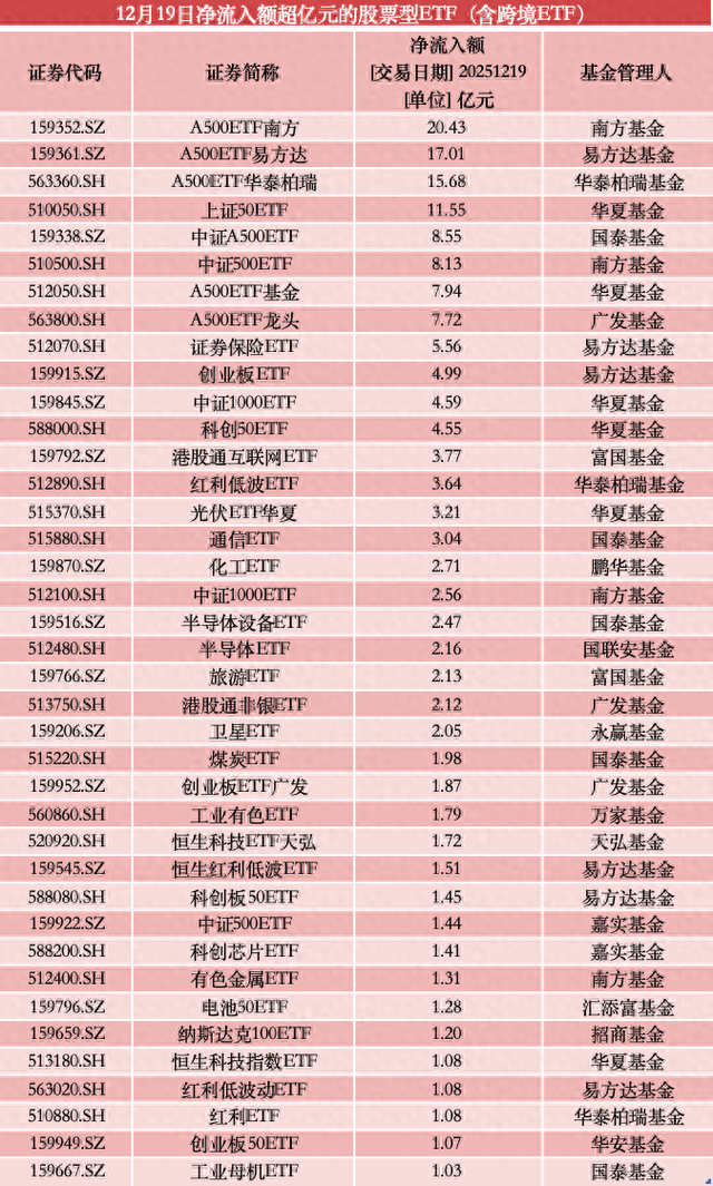 12月19日,易方达证券保险ETF净流入5.56亿元;富国港股通互联网ETF、华泰柏瑞红利低波ETF、华夏光伏ETF、国泰通信ETF、鹏华化工ETF、国泰半导体设备ETF、国联安半导体ETF、富国旅游ETF、广发港股通非银ETF、永赢卫星ETF等净流入规模也均超过2亿元。