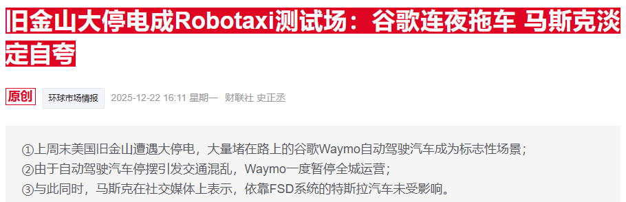 另值得一提的是,美国旧金山市上周末发生大规模停电事故,导致谷歌Waymo无人驾驶网约车服务暂停。社交媒体上出现一些车辆被卡在十字路口、甚至马路正中央的图片。