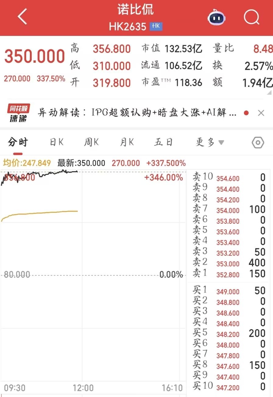12月23日,成都本土人工智能企业诺比侃正式在香港联合交易所主板挂牌上市。公司开盘价报319.8港元,较发行价大幅上涨300%。早盘交易时段,股价涨幅进一步扩大至346%,公司市值攀升至约133亿港元。