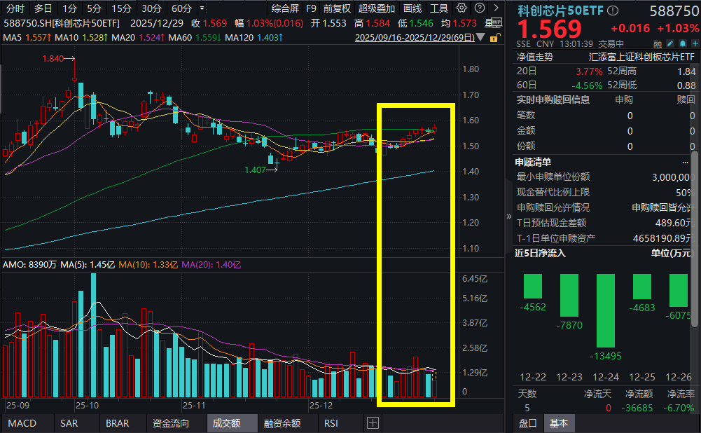 12月29日 13:00,AI主线持续活跃,科创人工智能ETF汇添富(589560)爆量涨2.05%,冲击6连涨,盘中成交额已赶超上一交易日全天成交额。科创芯片50ETF(588750)涨1%,反包上一交易日跌幅。