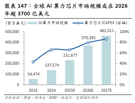 AI技术进步也驱动企业真金白银的基础设施投资,AI算力芯片需求强劲。科技巨头的资本开支在2025年达到了前所未有的规模,微软、谷歌、亚马逊等海外主要云厂商年度资本开支总额预计超过3000亿美元,其中绝大部分投向了数据中心建设和AI芯片采购。中国AI科技龙头亦同步加速资本投入!交银国际预测全球AI算力芯片市场规模或在2026年超3700亿美元,2027年超4600亿美元。