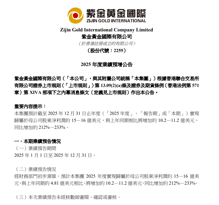 12月30日,紫金黄金国际(02259.HK)公告,预计2025年净利润约15-16亿美元,同比增加约212%-233%。