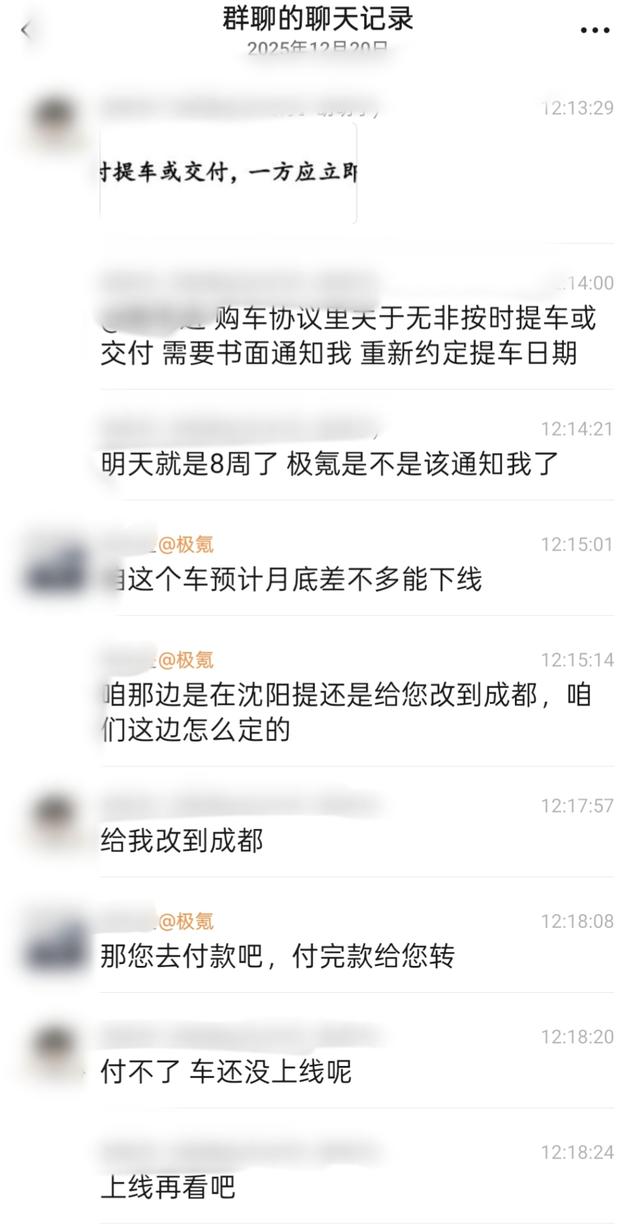 胡先生说,等车过程中,他因工作地点变动,曾多次通过线上沟通、拨打官方客服热线与极氪交付人员进行联系,希望了解车辆的生产状态以及能否按期交付。“若车辆能如期交付,对我就没有什么影响,但如果出现拖延,我就无法在沈阳极氪交付中心提车了,后续会有很多麻烦。”胡先生说。