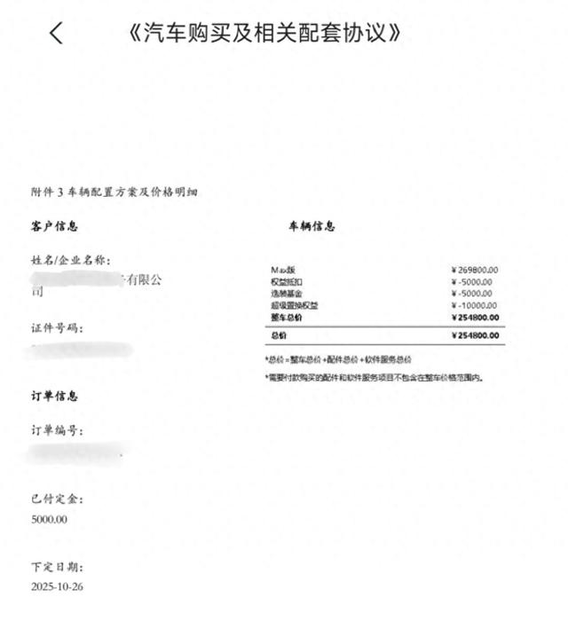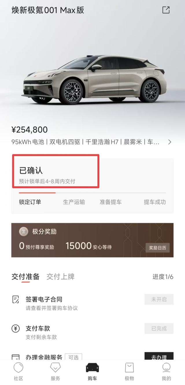 据胡先生介绍,2025年10月26日,他以其所在公司的名义订购了一台焕新极氪001Max版,支付了5000元定金并与极氪公司签订了购车协议。锁单后,极氪APP订单页面显示“预计4-8周交付”。