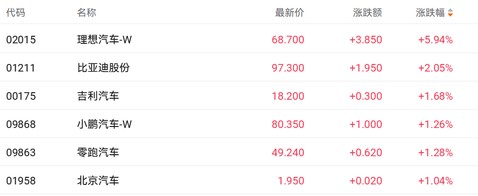财联社1月2日讯(编辑 胡家荣)今日汽车股多数上涨,其中理想汽车涨幅居前。截至发稿,理想汽车-W(02015.HK)涨5.94%、比亚迪股份(01211.HK)涨2.05%、吉利汽车(00175.HK)涨1.68%、零跑汽车(09863.HK)涨1.28%、小鹏汽车-W(09868.HK)涨1.26%。