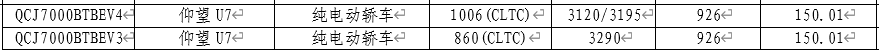 新一期《减免车辆购置税的新能源汽车车型目录》披露了新款仰望U7纯电版续航信息,将搭载容量为150.01kWh的电池组,CLTC纯电续航分别为1006km和860km;插电混动版车型继续搭载52.3987kWh电池,纯电续航里程分别为200km和220km。
