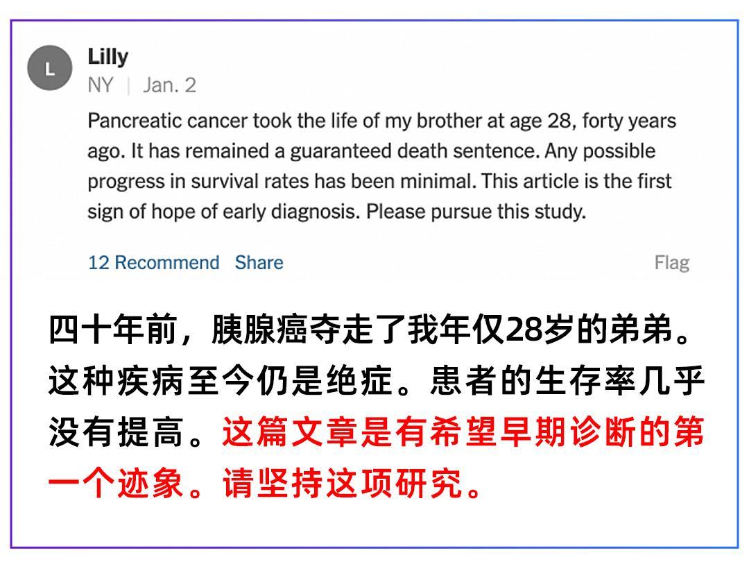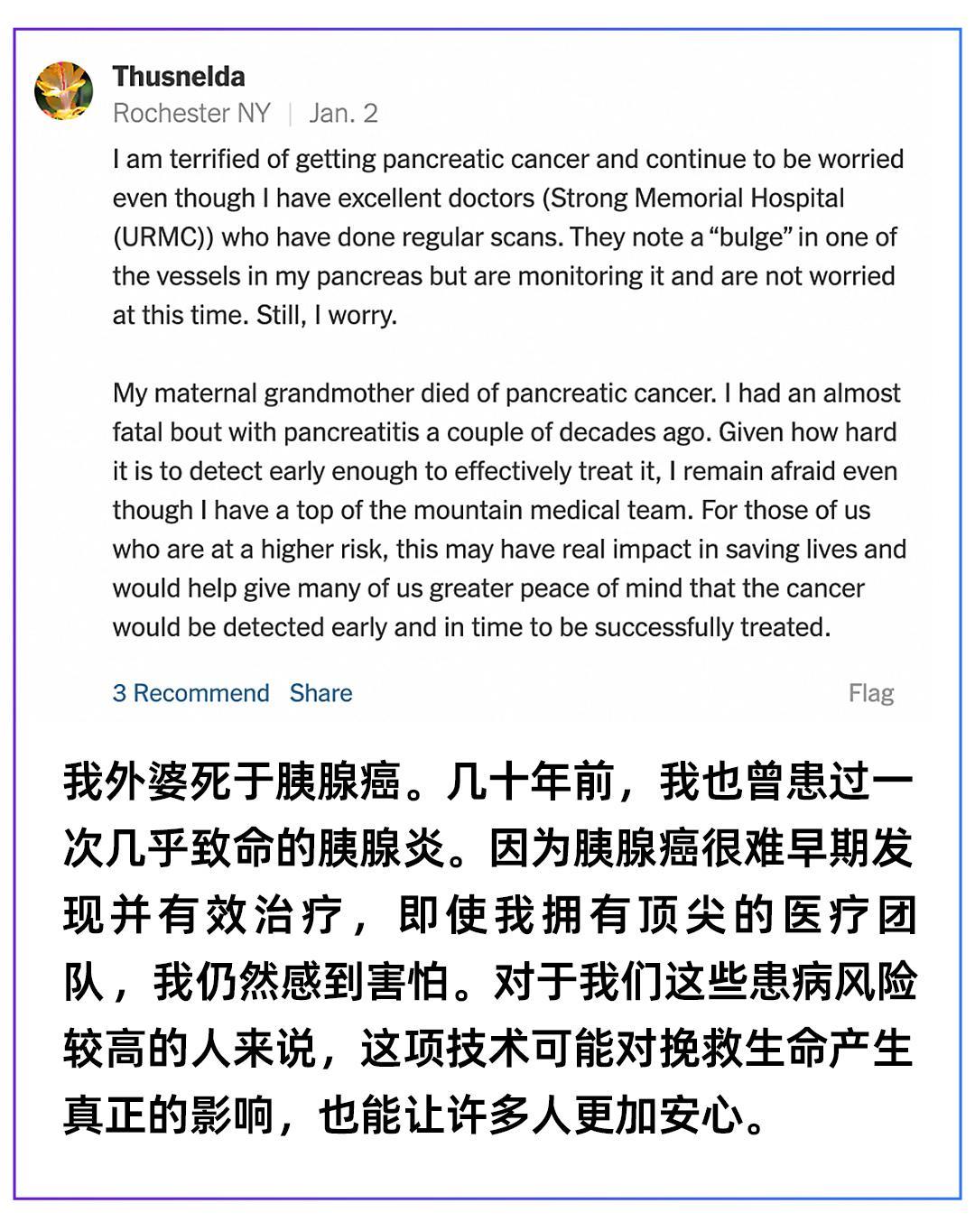 而一些被胰腺癌夺走亲朋好友的美国民众,则真情实感地期盼能用上这项中国AI,并鼓励中国AI研究人员:“这项研究能让许多人安心”“请坚持这项研究”。