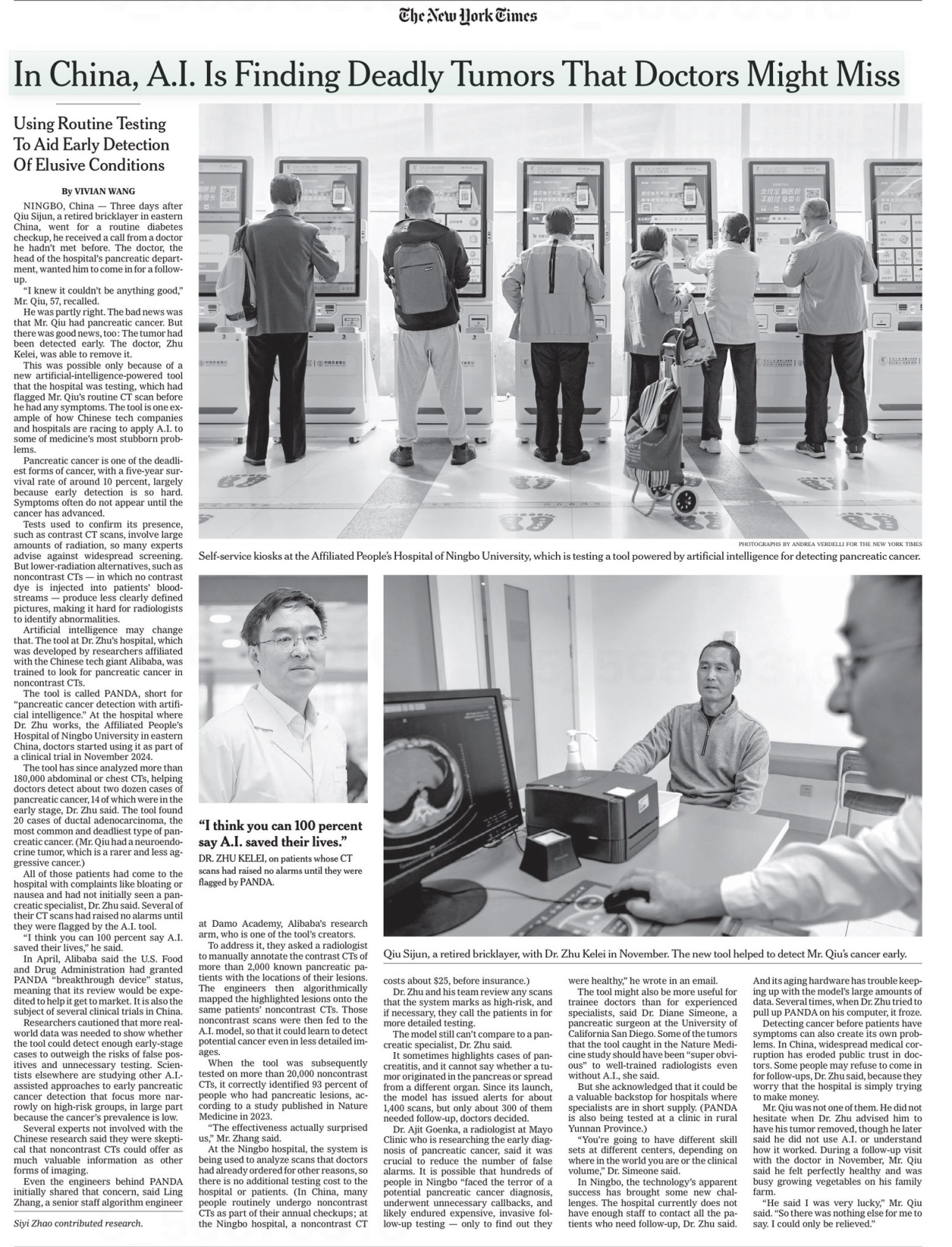 这是《纽约时报》2026年首篇关于中国的报道,英文标题为In China, A.I. Is Finding Deadly Tumors That Doctors Might Miss,中文标题为《“AI救了他的命”:中国医生借助人工智能识别胰腺癌》。记者来到宁波一家医院,实地采访了57岁的退休泥瓦匠邱先生,他去医院查糖尿病,却接到电话,说AI在他的平扫CT片里发现了胰腺癌。万幸的是,他的胰腺癌还在早期,顺利做了手术切除。