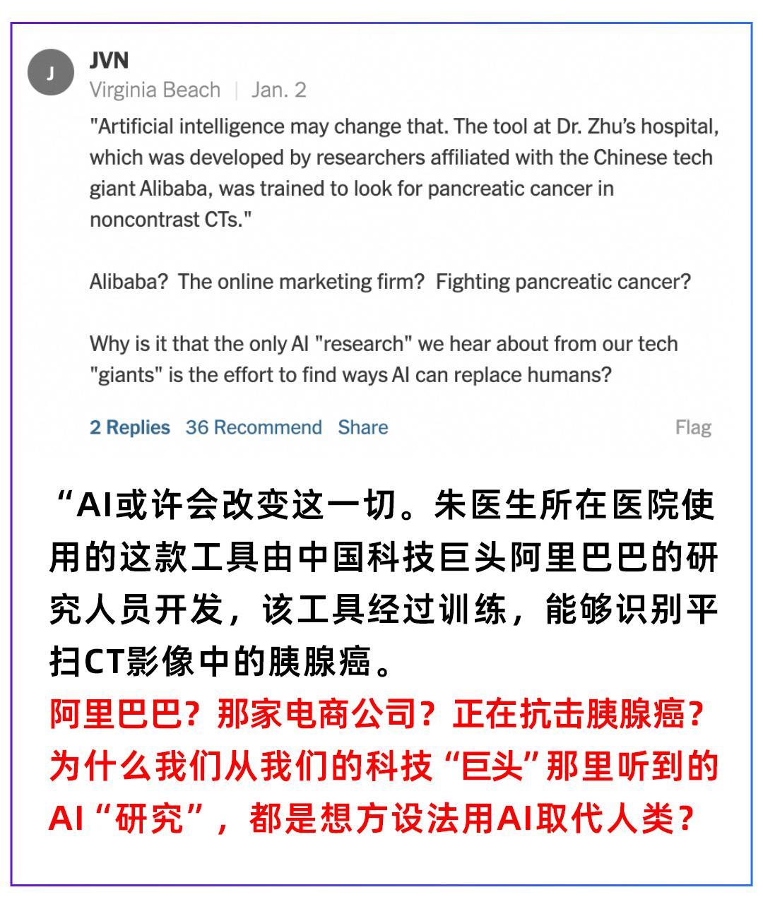 甚至有美国网友说:“阿里巴巴?那家电商公司?正在抗击胰腺癌?为什么我们从我们的科技巨头那里听到的AI研究,都是怎么用AI取代人类?”