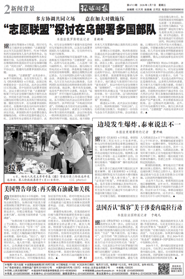 新德里电视台称,在美国政府对印度与俄罗斯的能源贸易审查日益趋严之际,特朗普发出了这一新警告。印度表示,采购俄罗斯石油是保障本国能源安全的必要之举。就在几周前,特朗普与莫迪进行了电话会谈,双方均强调尽管关税相关的紧张局势仍在持续,但保持双边贸易关系的良好发展势头至关重要。此次通话恰逢印美两国官员启动新一轮谈判之际,旨在解决长期存在的贸易僵局。相关谈判虽然开启,但在美国对印度进口商品加征最高达50%的关税后,谈判进程被迫中断。美国对委内瑞拉发动的军事打击,再次将石油问题推至风口浪尖。(伊文)