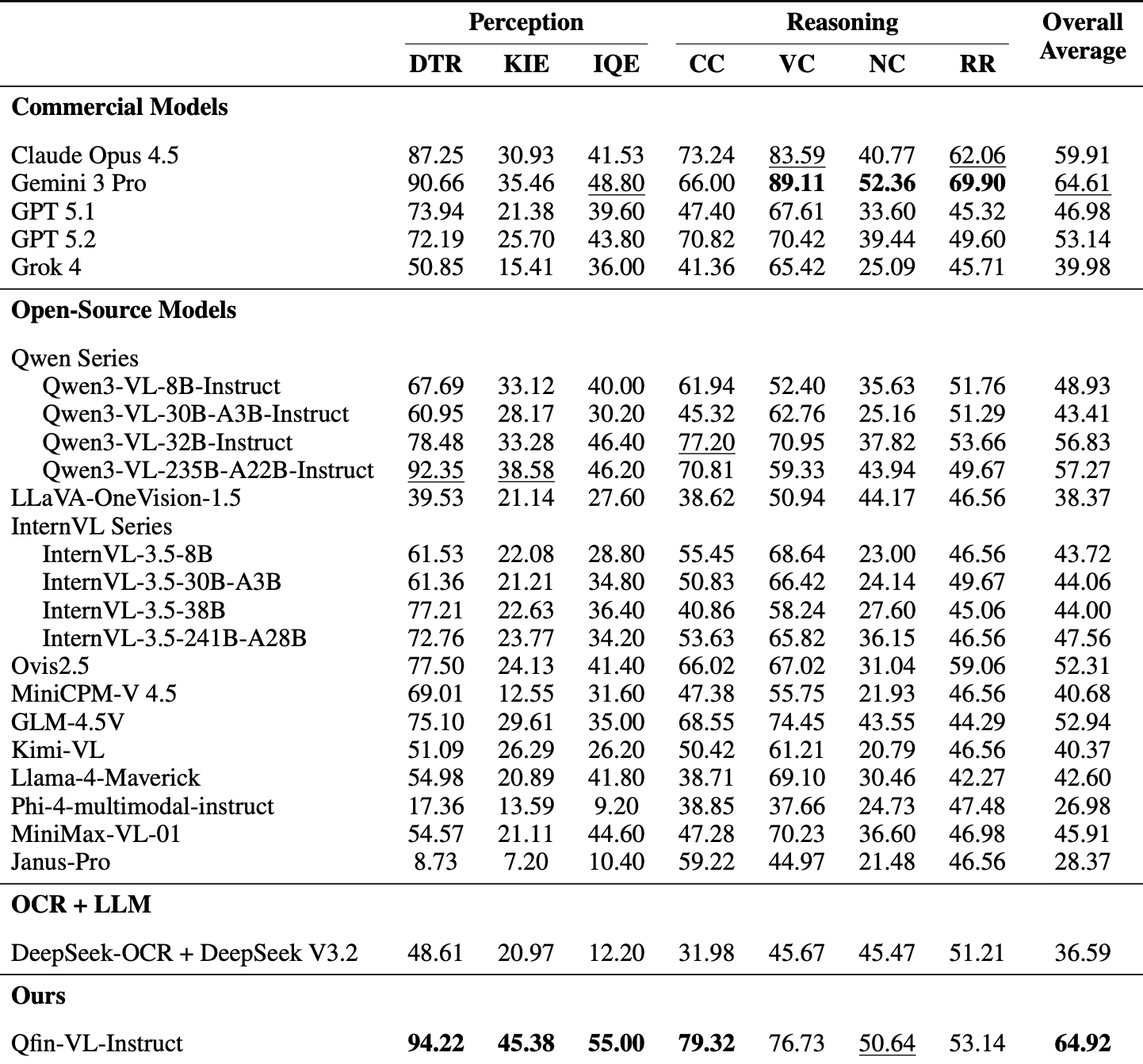 通过对23个主流多模态模型(来自14家顶尖AI企业及科研机构)的全面评测,FCMBench展现出强大的鉴别能力。结果显示, Google DeepMind的Gemini 3 Pro(64.61)位列商业模型榜首,阿里巴巴Qwen3-VL-235B(57.27)成为最佳的开源基模。而奇富科技自研的信贷垂类多模态大模型Qfin-VL-Instruct以64.92的F1分数斩获综合第一,该模型基于奇富实际业务场景进行研发,彰显了垂类领域定制化训练的优势,该模型的试用接口已向公众开放。