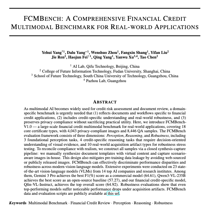 近日,奇富科技联合复旦大学与华南理工大学研究人员共同发布首个面向信贷场景的多模态评测基准FCMBench-V1.0 (Financial Credit Multimodal Benchmarks)。该基准基于真实信贷业务场景,抽象科学问题,设计多模态评估任务与挑战,以期构建来源于业务、服务于业务的实用性评测体系,推动信贷AI的学术研究与应用落地。同时,奇富科技宣布开源数据集与评测工具,为行业共建AI基础设施提供关键支撑。