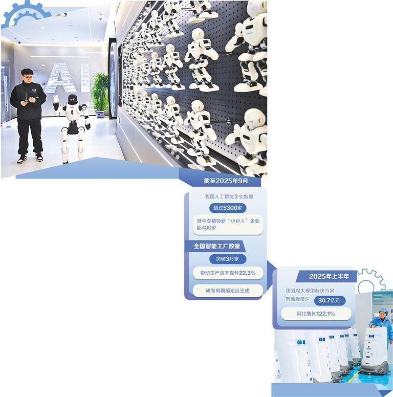 2025年,人工智能加速进入千行百业,应用落地不断深化。“人工智能正深度嵌入制造体系,全国智能工厂数量突破3万家,带动生产效率提升22.3%,研发周期缩短近三成。”刘丽超介绍,2025年上半年,我国AI大模型解决方案市场规模达30.7亿元,同比增长122.1%,企业积极在重点行业拓展人工智能应用场景。