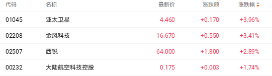 截至收盘,亚太卫星(01045.HK)涨3.96%、金凤科技(02208.HK)涨3.41%、大陆航天科技控股(00232.HK)涨1.74%。