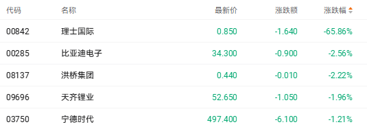截至收盘,理士国际(00842.HK)跌65.86%、比亚迪电子(00285.HK)跌2.58%、洪桥集团(08137.HK)跌2.22%。