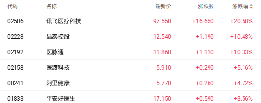 截至收盘,讯飞医疗科技(02506.HK)涨20.58%、晶泰控股(02228.HK)涨10.48%、阿里健康(00241.HK)涨4.72%。