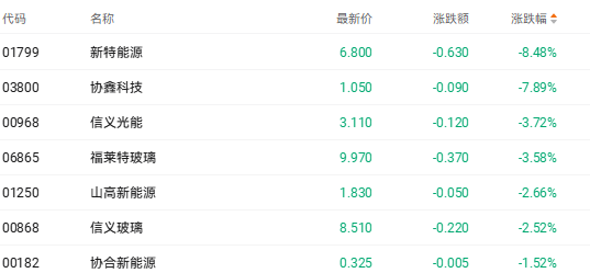 光伏股同样走弱,截至收盘,新特能源(01799.HK)跌8.48%、协鑫科技(03800.HK)跌7.89%、信义光能(00968.HK)跌3.72%。