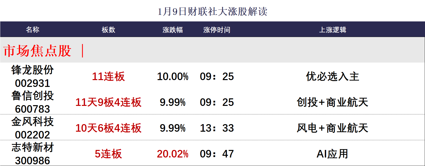 财联社1月9日讯,今日94股涨停,47股炸板,封板率为67%,锋龙股份11连板,志特新材20cm5连板,快意电梯、银河电子5连板,江顺科技4连板,东方明珠、中国一重、弘讯科技3连板,鲁信创投11天9板,金风科技10天6板,中国卫通9天5板。沪指高开高走突破4100点,深成指涨超1%。沪深两市成交额3.12万亿,较上一个交易日放量3224亿,时隔73个交易日后再度站上3万亿大关,历史第五次突破3万亿。盘面上,市场热点快速轮动,全市场超3900只个股上涨,连续2日超百股涨停。板块方面,AI应用、商业航天、可控核聚变、小金属板块涨幅居前;保险、光伏、脑机接口、银行板块表现落后。