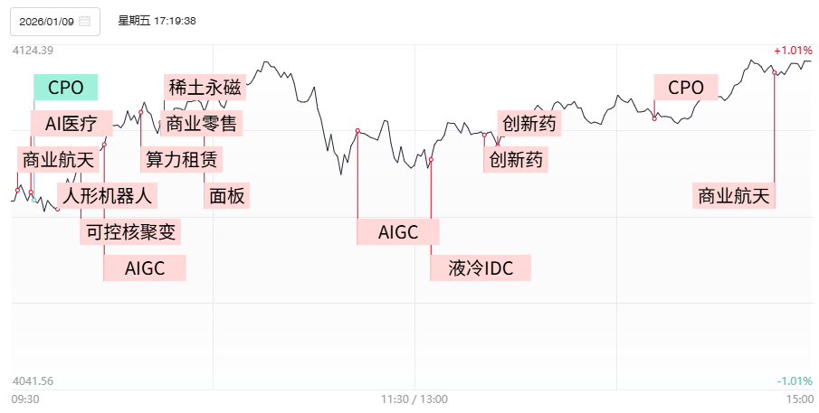 2025年AI应用在消费层的渗透快速推进。根据QuestMobile上月统计数据,原生AI市场中豆包1.55亿周活稳居榜首,DeepSeek8000万+、元宝2000万+位列二三席。大模型流量红利被视为互联网流量第三次革命,AI广告营销行业的GEO概念持续受到市场关注,引力传媒反包涨停走出5天4板,易点天下、天龙集团、利欧股份、浙文互联等多股封板,AI营销龙头蓝色光标收涨超14%,距离历史高点仅一步之遥。而受到OpenAI发布ChatGPT健康的消息刺激,AI医疗、AI制药概念也持续火爆,泓博医药、美年健康、国新健康等多股封涨停,进而带动前沿生物、维康药业等创新药概念股午后大面积补涨。事实上包括AI制药在内的整个AI for Science概念已经成为整个大模型在实体经济领域中的率先落地方向,随着志特新材实现晋级5连板,AI for Science热度有望由点及面持续铺开。