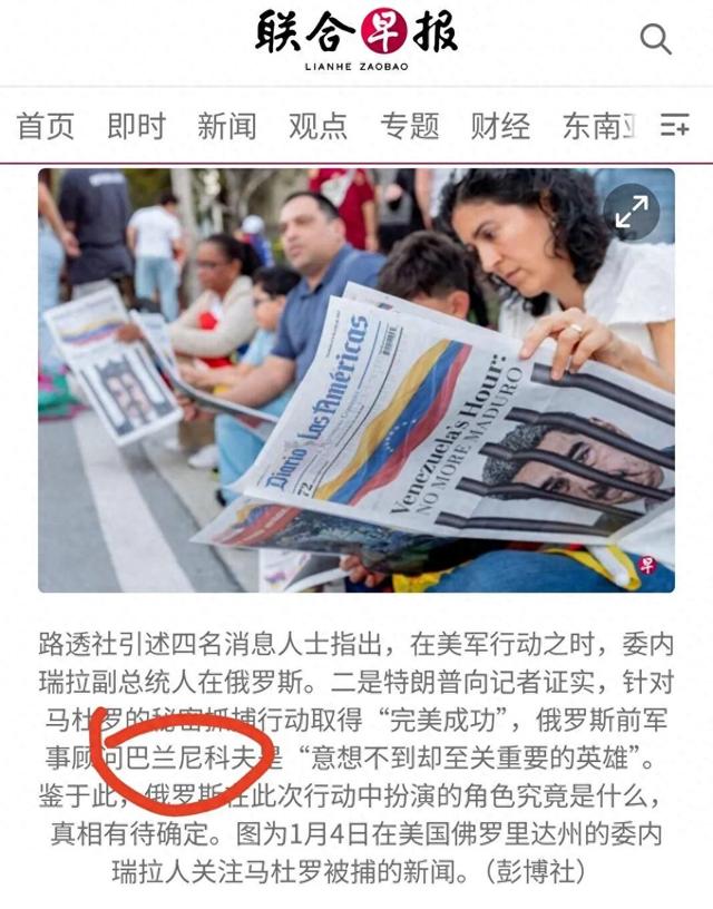 1月3日凌晨,美军强行控制委内瑞拉总统马杜罗并将其带往美国。事件发生后,网络上流传多种说法,其中一则传言称,“美国总统特朗普向记者证实,针对马杜罗的秘密抓捕行动取得‘完美成功’,俄罗斯前军事顾问巴兰尼科夫是‘意想不到却至关重要的英雄’。”
