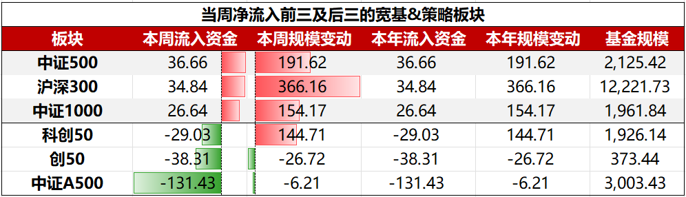 具体到细分板块,宽基&策略板块ETF中,净流入前三大板块依次为:中证500、沪深300、中证1000;净流出前三大板块依次为:中证A500、创50、科创50。