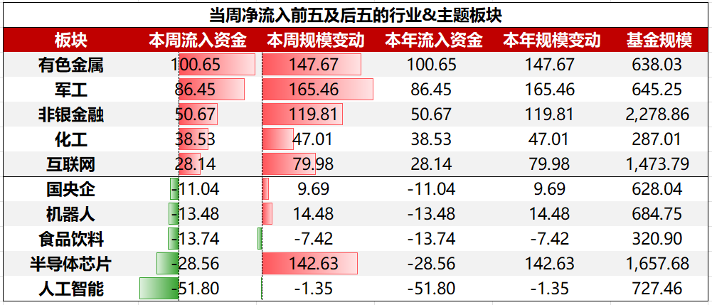 行业&主题板块ETF中,净流入前五大板块依次为:有色金属、军工、非银金融、化工、互联网;净流出前五大板块依次为:人工智能、半导体芯片、食品饮料、机器人、国央企。