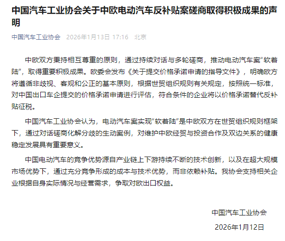 据中国汽车工业协会官微消息,中国汽车工业协会发布关于中欧电动汽车反补贴案磋商取得积极成果的声明,内容如下: