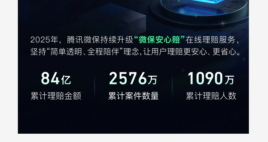 腾讯官方保险代理平台——腾讯微保近日发布了2025年理赔服务年度报告(下称:报告)。数据显示,截至2025年12月31日,经腾讯微保平台完成的累计理赔金额达84亿元,累计服务理赔案件数量突破2576万件,累计服务理赔人数达1090万人。