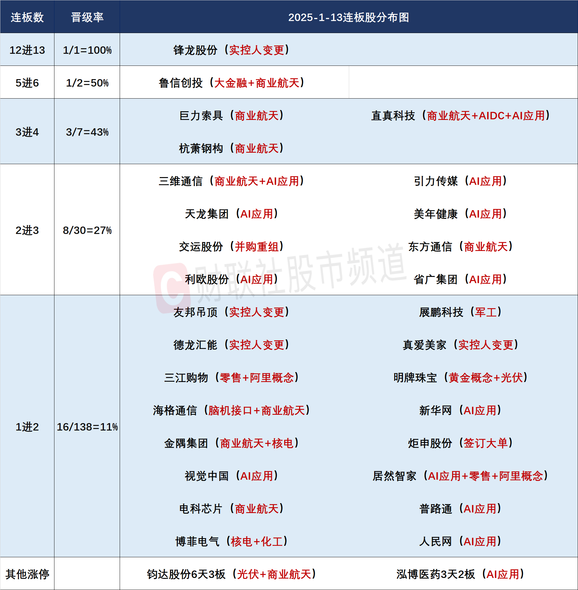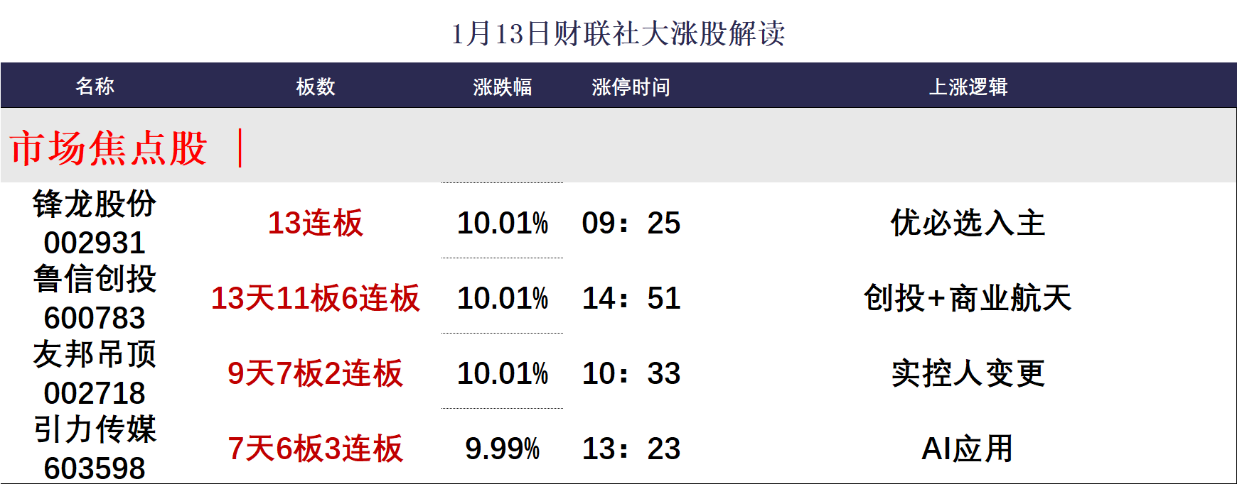 财联社1月13日讯,今日66股涨停,61股炸板,封板率为52%,锋龙股份13连板,鲁信创投13天11板,杭萧钢构、巨力索具、直真科技4连板,三维通信、交运股份、省广集团、美年健康3连板,友邦吊顶9天7板,引力传媒7天6板,利欧股份8天5板,东方通信9天5板。三大指数集体调整,创业板指冲高回落跌近2%,科创50指数盘中一度跌超3%。沪深两市成交额3.65万亿,较上一个交易日放量496亿,续创成交金额历史新高。盘面上,全市场超3700只个股下跌。板块方面,AI医疗、AI应用、贵金属板块领涨,商业航天、CPO、半导体等板块调整。截至收盘,沪指跌0.64%,深成指跌1.37%,创业板指跌1.96%。