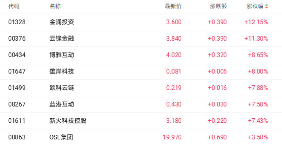 受全球加密货币市场大涨提振,港股相关概念股表现活跃。截至收盘,金涌投资(01328.HK)涨12.15%、雄岸科技(01647.HK)涨8%、蓝港互动(08267.HK)涨7.50%。