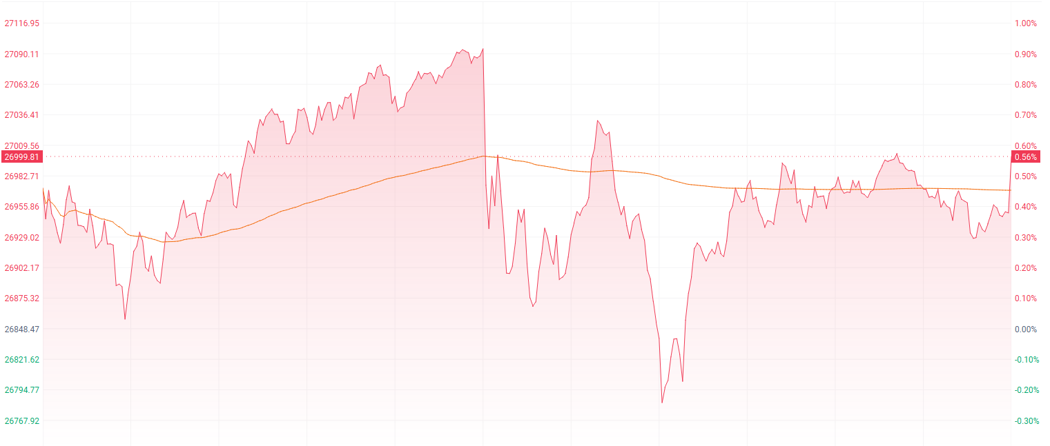 财联社1月14日讯(编辑 胡家荣) 港股三大指数延续近日涨势。截至收盘,恒生指数涨0.56%,报26999.81点;科技指数涨0.66%,报5908.26点;国企指数涨0.32%,报9315.56点。