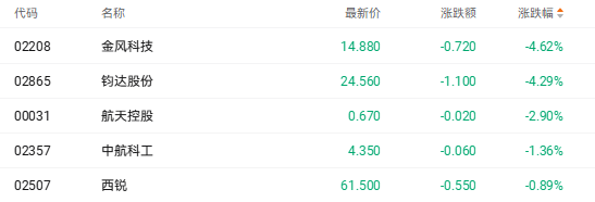 商业航天股延续弱势。截至收盘,金风科技(02208.HK)涨4.62%、钧达股份(02865.HK)跌4.29%、航天控股(00031.HK)跌2.90%。