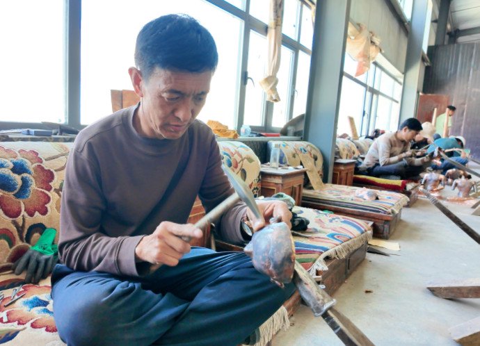 在南木林县艾玛乡孜东雪村铜器加工厂,锤声叮当——国家级传承人列旦桑布正带年轻人接力技艺。他自幼痴迷铜器,师从外祖父(第五代传承人赞拉多吉),24岁便精通全流程工艺,至今已培养28名徒弟。“我们守传统精髓,也顺市场需求。”列旦桑布说,孜东铜器全手工制作,涵盖制模、雕刻等十余环节,既保留宗教用品传统,更开发生活用品、旅游纪念品,他还曾参与罗布林卡、西藏博物馆文物修复,足迹遍及藏 区及青海、四川等地。