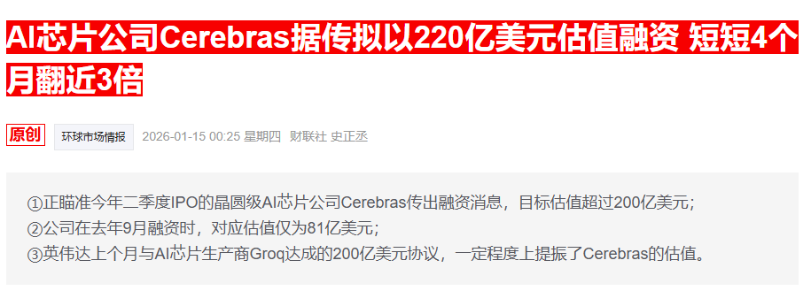 据知情人士透露,作为2026年潜在的热门IPO之一,Cerebras目前据传正在推进一轮Pre-IPO融资。据知情人士称,Cerebras正在洽谈筹资约10亿美元,目标估值为220亿美元——较上一轮融资时翻了将近三倍。作为对比,该公司上一次融资是在2025年9月,以81亿美元的估值筹得约11亿美元。