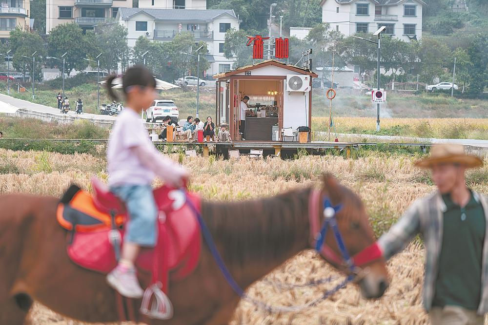咖啡店带动了村民的小摊售卖和文旅产业。2025年11月1日,一村民买来马匹,在收割后的田地里提供给游客骑行拍照。