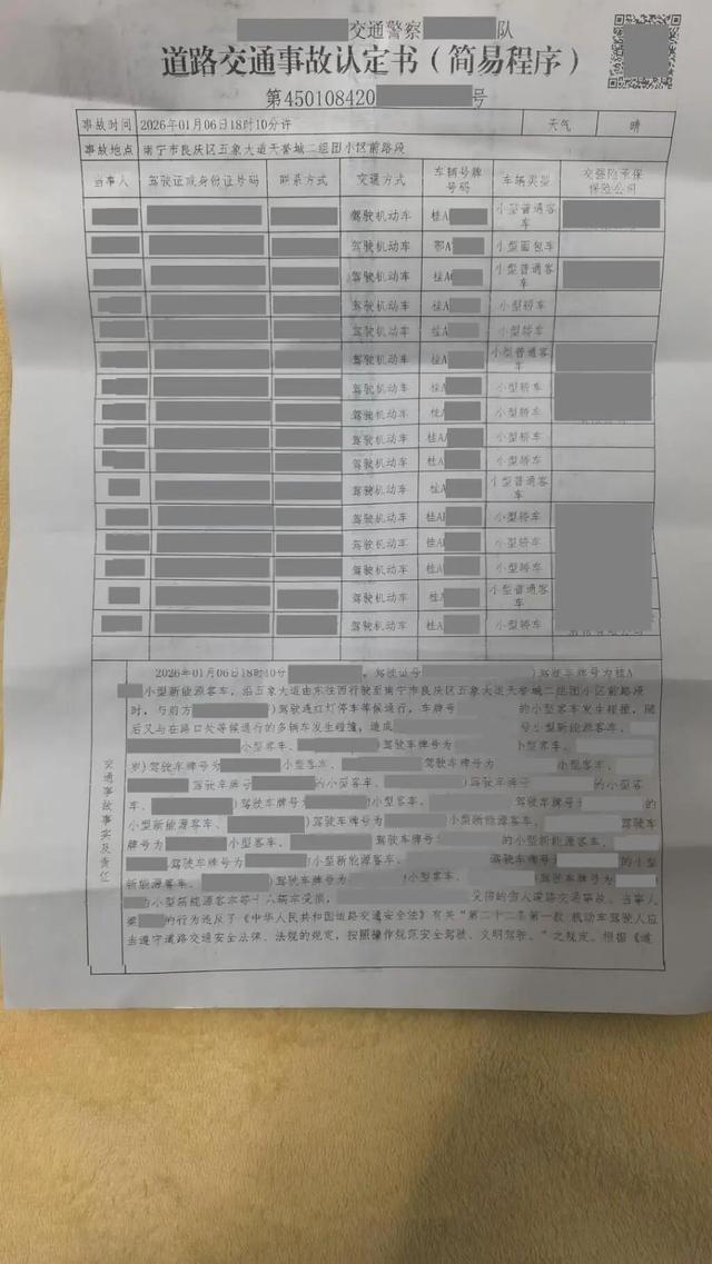 1月6日,一辆阿维塔07在广西南宁因超速驾驶连续与15辆车发生碰撞,当地交警已做现场调查处理,并出具事故认定书,明确事故原因为驾驶员导致。