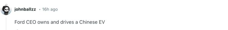还有网友提到了美国福特汽车首席执行官:“福特CEO就拥有并驾驶一辆中国电动汽车。” ↓